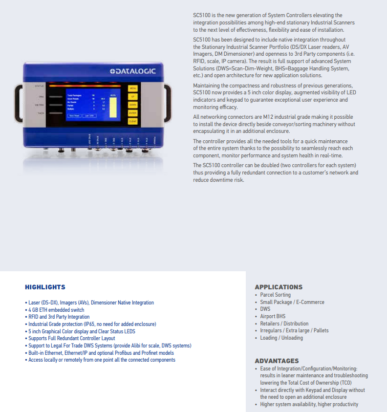 得利捷SC5100固定式工業(yè)系統(tǒng)控制器的設計包含了整個固定式工業(yè)掃描器組合(DS/DX系列激光閱讀器、AV系列掃描器、DM系列體積測量儀)的本公司產品集成,且支持第三方組件(如RFID、秤、網(wǎng)絡相機)的集成開放接口。其結果是完全支持的系統(tǒng)解決方案(DWS=Scan-Dim-Weight,BHS=Baggage Handling等),并為新的應用解決方案提供