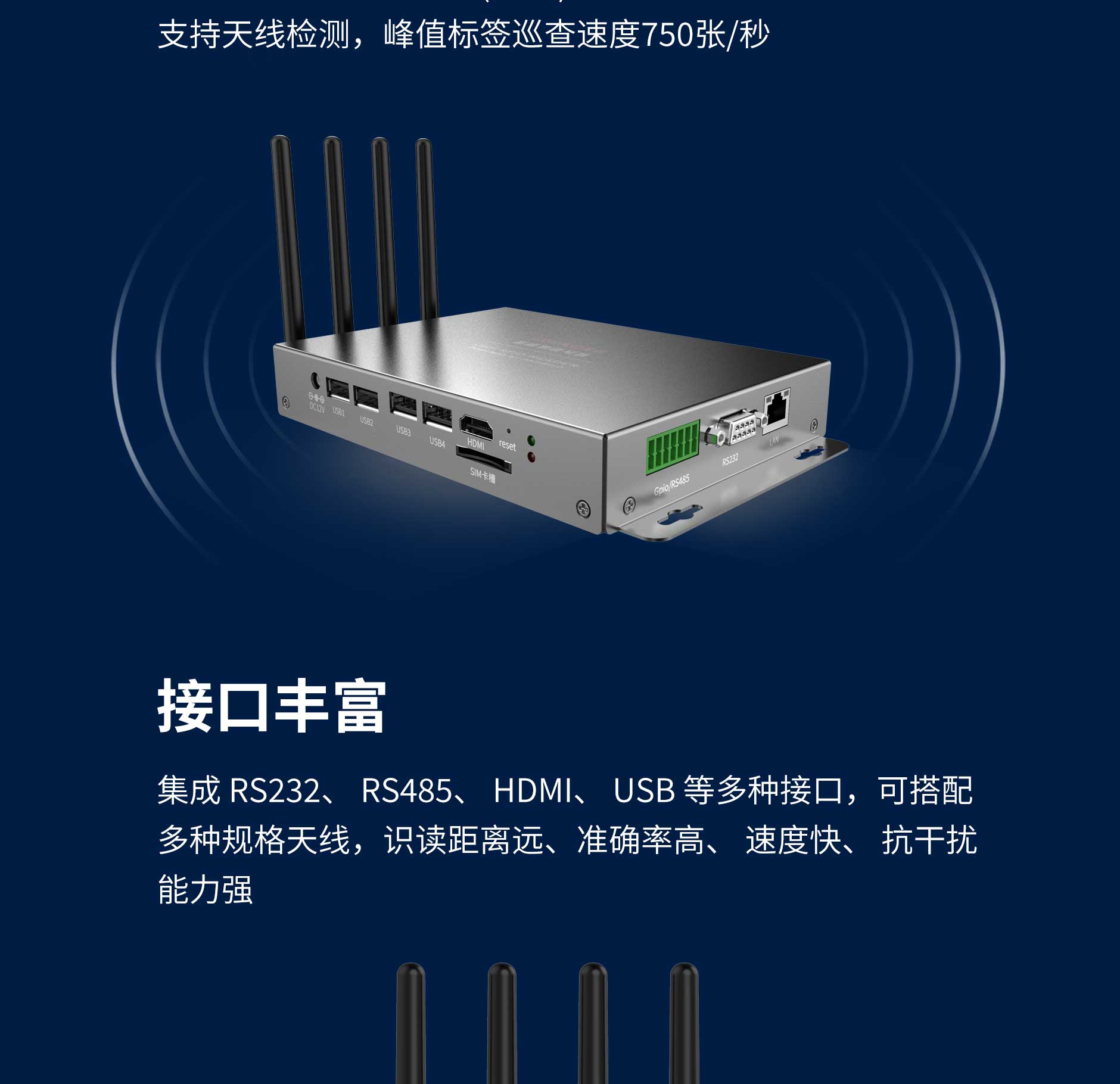 | 其他 | 8口SMA超高頻天線接口(可選配4口模塊) 以太網口(RJ45); RS232(DB9),RS485 HDMI 支持4路光耦隔離GPIO,隔離電壓VRMS>3kV、支持選配報警器,可發(fā)送指令控制報警器開啟、關閉 |